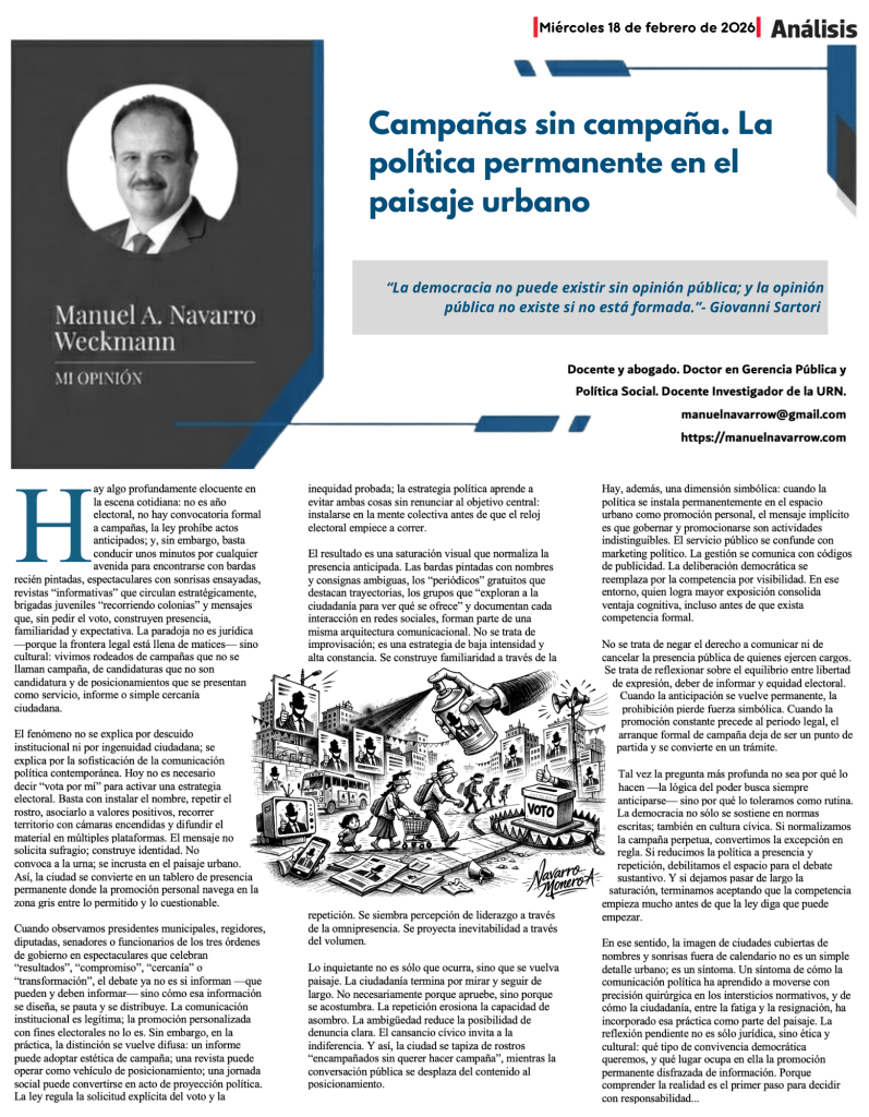 Hay algo profundamente elocuente en la escena cotidiana: no es año electoral, no hay convocatoria formal a campañas, la ley prohíbe actos anticipados; y, sin embargo, basta conducir unos minutos por cualquier avenida para encontrarse con bardas recién pintadas, espectaculares con sonrisas ensayadas, revistas “informativas” que circulan estratégicamente, brigadas juveniles “recorriendo colonias” y mensajes que, sin pedir el voto, construyen presencia, familiaridad y expectativa. La paradoja no es jurídica —porque la frontera legal está llena de matices— sino cultural: vivimos rodeados de campañas que no se llaman campaña, de candidaturas que no son candidatura y de posicionamientos que se presentan como servicio, informe o simple cercanía ciudadana.