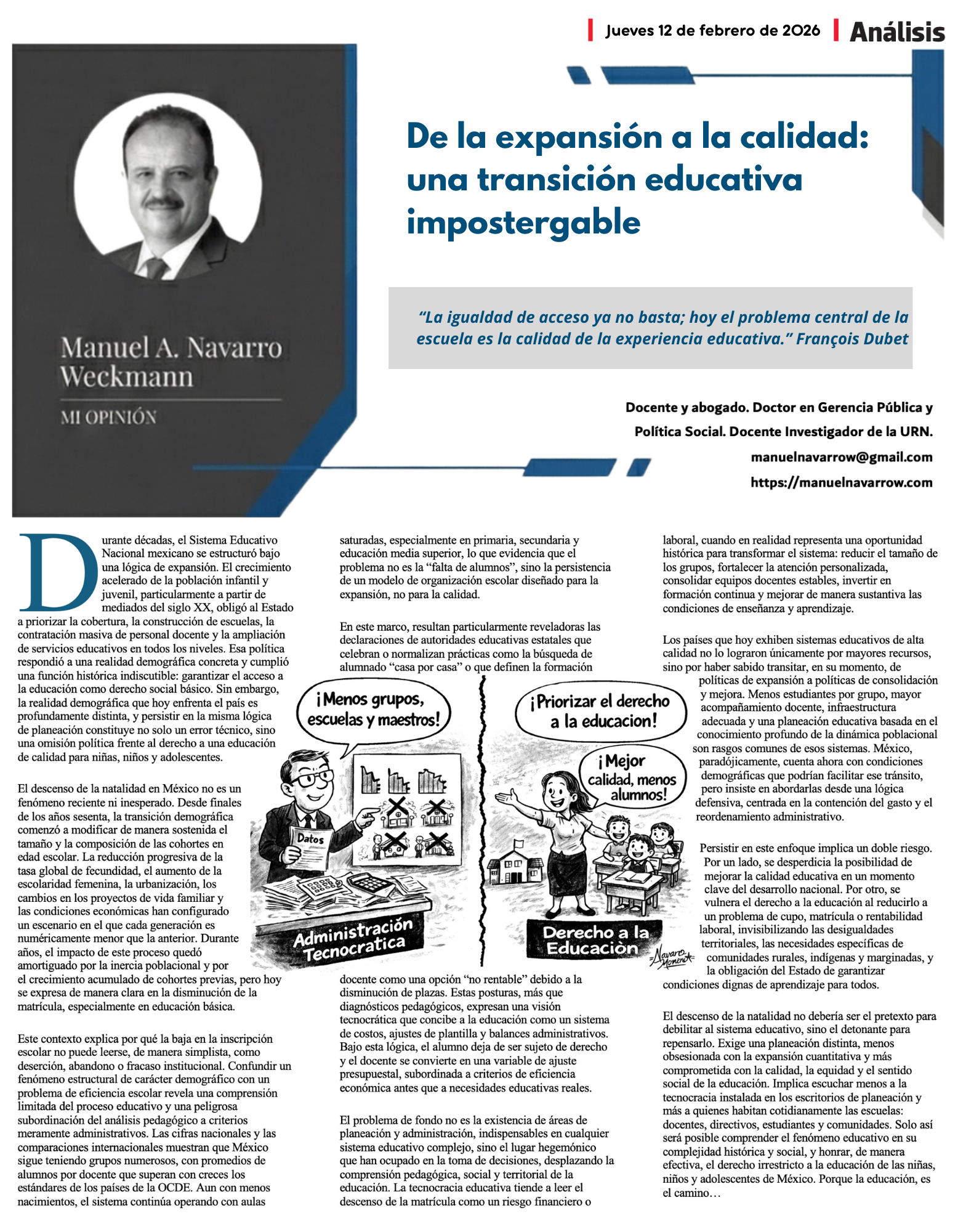 El descenso de la natalidad no debería ser el pretexto para debilitar al sistema educativo, sino el detonante para repensarlo. Exige una planeación distinta, menos obsesionada con la expansión cuantitativa y más comprometida con la calidad, la equidad y el sentido social de la educación. Implica escuchar menos a la tecnocracia instalada en los escritorios de planeación y más a quienes habitan cotidianamente las escuelas: docentes, directivos, estudiantes y comunidades. Solo así será posible comprender el fenómeno educativo en su complejidad histórica y social, y honrar, de manera efectiva, el derecho irrestricto a la educación de las niñas, niños y adolescentes de México.