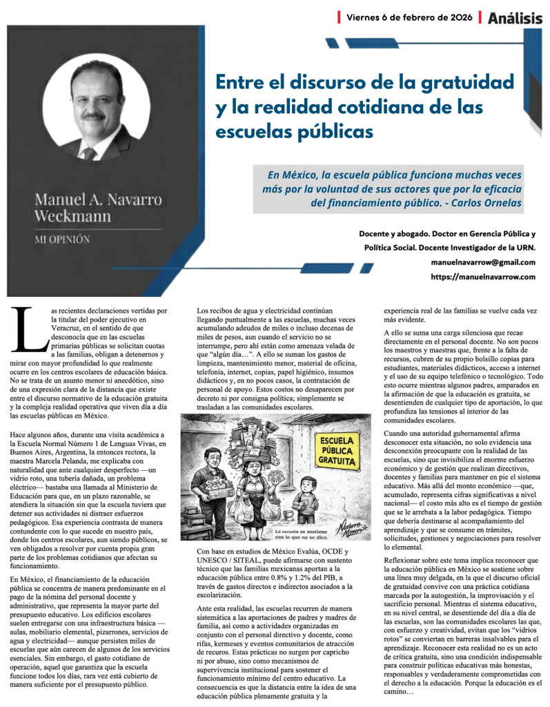 Las recientes declaraciones vertidas por la titular del poder ejecutivo en Veracruz, en el sentido de que desconocía que en las escuelas primarias públicas se solicitan cuotas a las familias, obligan a detenernos y mirar con mayor profundidad lo que realmente ocurre en los centros escolares de educación básica. No se trata de un asunto menor ni anecdótico, sino de una expresión clara de la distancia que existe entre el discurso normativo de la educación gratuita y la compleja realidad operativa que viven día a día las escuelas públicas en México.
