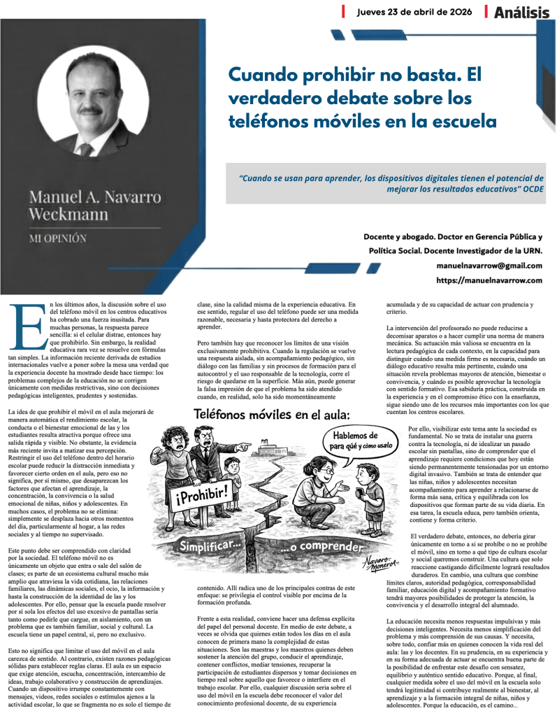 En los últimos años, la discusión sobre el uso del teléfono móvil en los centros educativos ha cobrado una fuerza inusitada. Para muchas personas, la respuesta parece sencilla: si el celular distrae, entonces hay que prohibirlo. Sin embargo, la realidad educativa rara vez se resuelve con fórmulas tan simples. La información reciente derivada de estudios internacionales vuelve a poner sobre la mesa una verdad que la experiencia docente ha mostrado desde hace tiempo: los problemas complejos de la educación no se corrigen únicamente con medidas restrictivas, sino con decisiones pedagógicas inteligentes, prudentes y sostenidas.