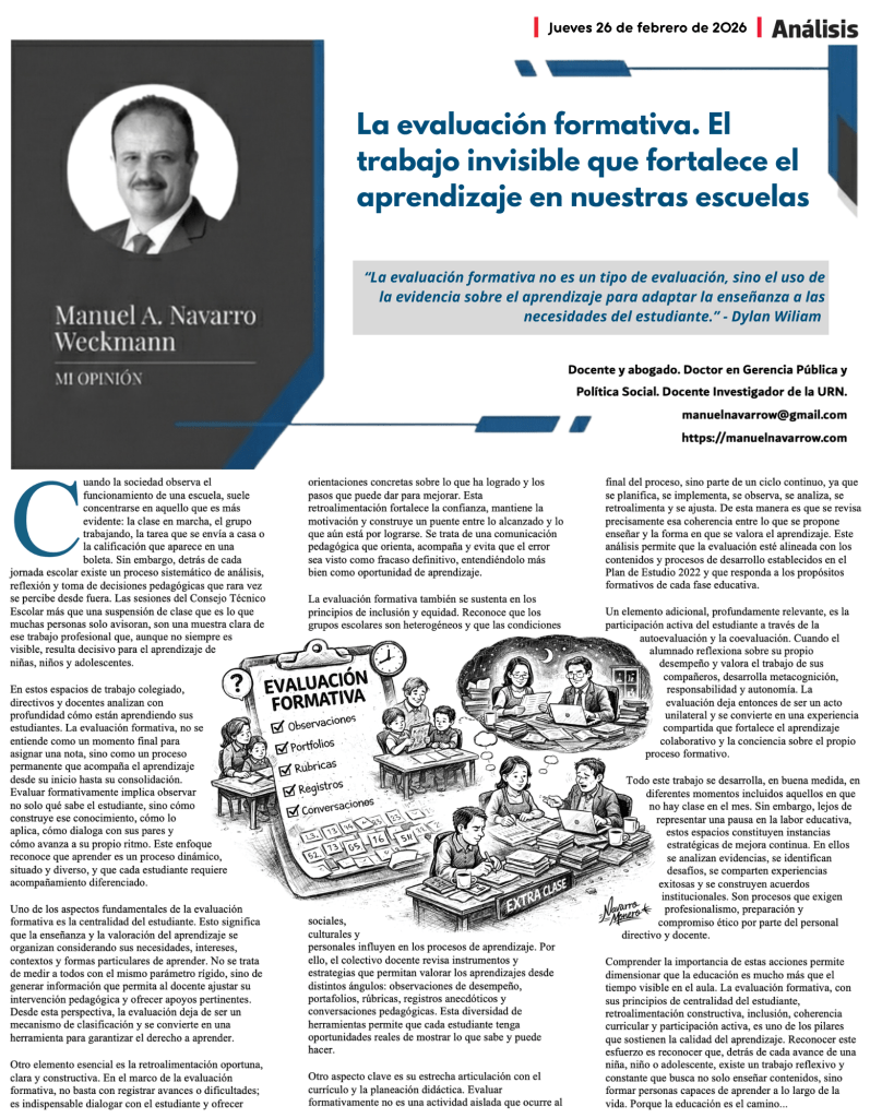 Comprender la importancia de estas acciones permite dimensionar que la educación es mucho más que el tiempo visible en el aula. La evaluación formativa, con sus principios de centralidad del estudiante, retroalimentación constructiva, inclusión, coherencia curricular y participación activa, es uno de los pilares que sostienen la calidad del aprendizaje. Reconocer este esfuerzo es reconocer que, detrás de cada avance de una niña, niño o adolescente, existe un trabajo reflexivo y constante que busca no solo enseñar contenidos, sino formar personas capaces de aprender a lo largo de la vida. Porque la educación es el camino…