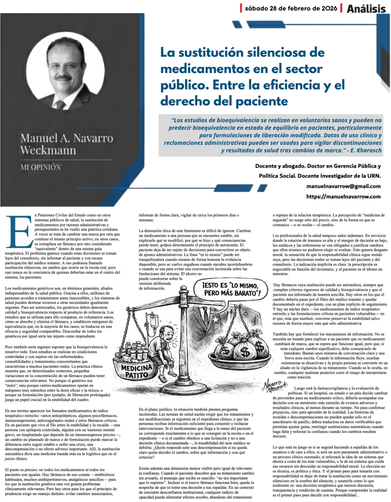 En Pensiones Civiles del Estado como en otros sistemas públicos de salud, la sustitución de medicamentos por razones administrativas y presupuestales se ha vuelto una práctica cotidiana. A veces se trata de cambiar una marca por otra que contiene el mismo principio activo; en otros casos, se reemplaza un fármaco por otro considerado “equivalente” dentro de una misma guía terapéutica. El problema aparece cuando estas decisiones se toman lejos del consultorio, sin informar al paciente y con escasa participación del médico tratante. A eso podemos llamarle sustitución silenciosa, un cambio que ocurre en la receta real, pero casi nunca en la conciencia de quienes deberían estar en el centro del sistema, los pacientes.