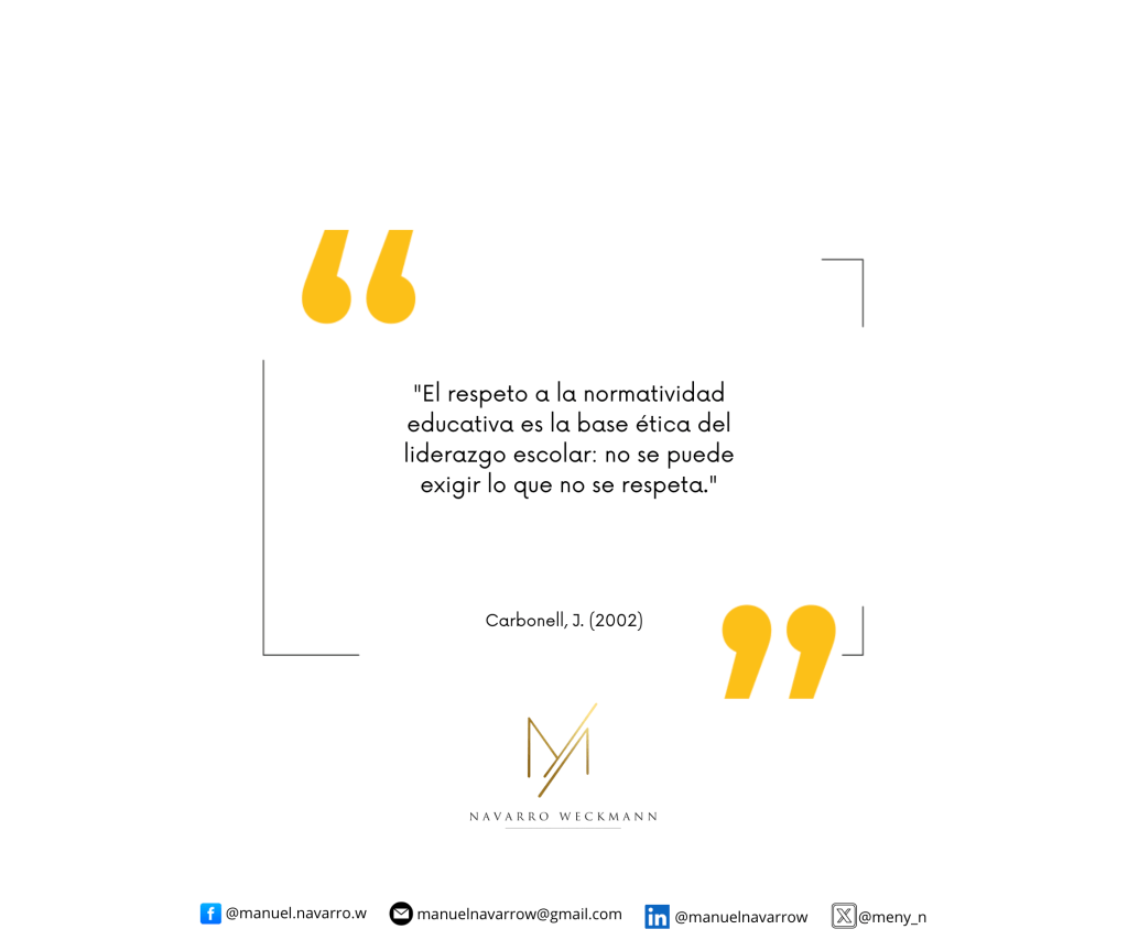 Jaume Carbonell (2002) plantea una idea fundamental para quienes ejercen la dirección escolar: el respeto a la normatividad educativa constituye la base ética del liderazgo; no es legítimo exigir aquello que uno mismo no practica. Esta afirmación, sencilla en apariencia, tiene profundas implicaciones para la vida cotidiana de los centros escolares.