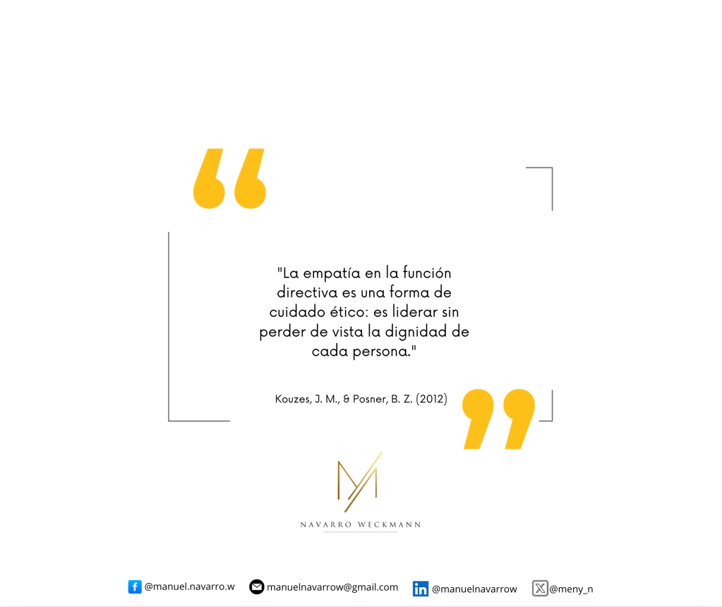 Kouzes y Posner (2012) señalan que la empatía en la función directiva constituye una forma de cuidado ético: liderar sin perder de vista la dignidad de cada persona. Esta afirmación no es solo una invitación a la sensibilidad, sino un llamado profundo a comprender la esencia del liderazgo educativo.