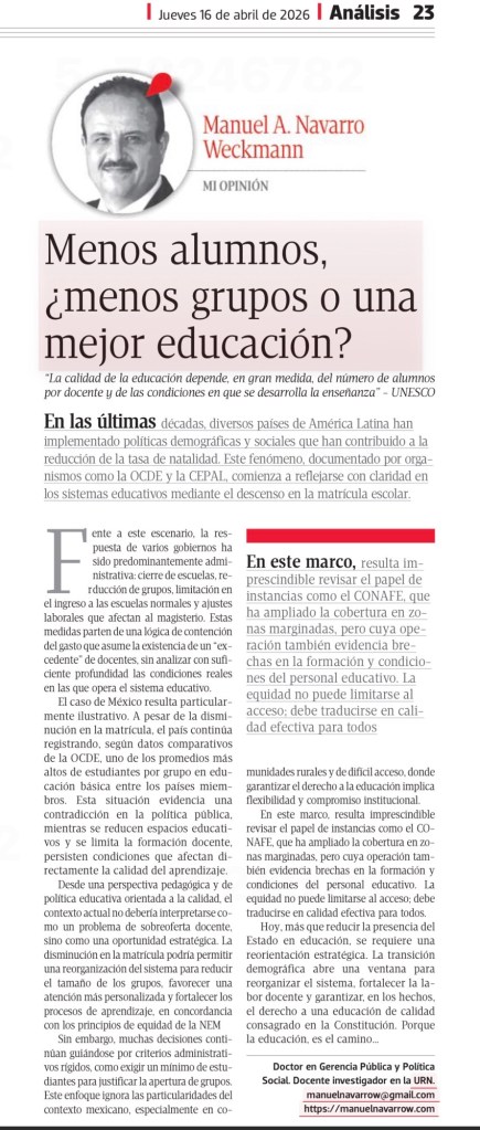 Desde una perspectiva pedagógica y de política educativa orientada a la calidad, el contexto actual no debería interpretarse como un problema de sobreoferta docente, sino como una oportunidad estratégica. La disminución en la matrícula podría permitir una reorganización del sistema para reducir el tamaño de los grupos, favorecer una atención más personalizada y fortalecer los procesos de aprendizaje, en concordancia con los principios de equidad de la NEM