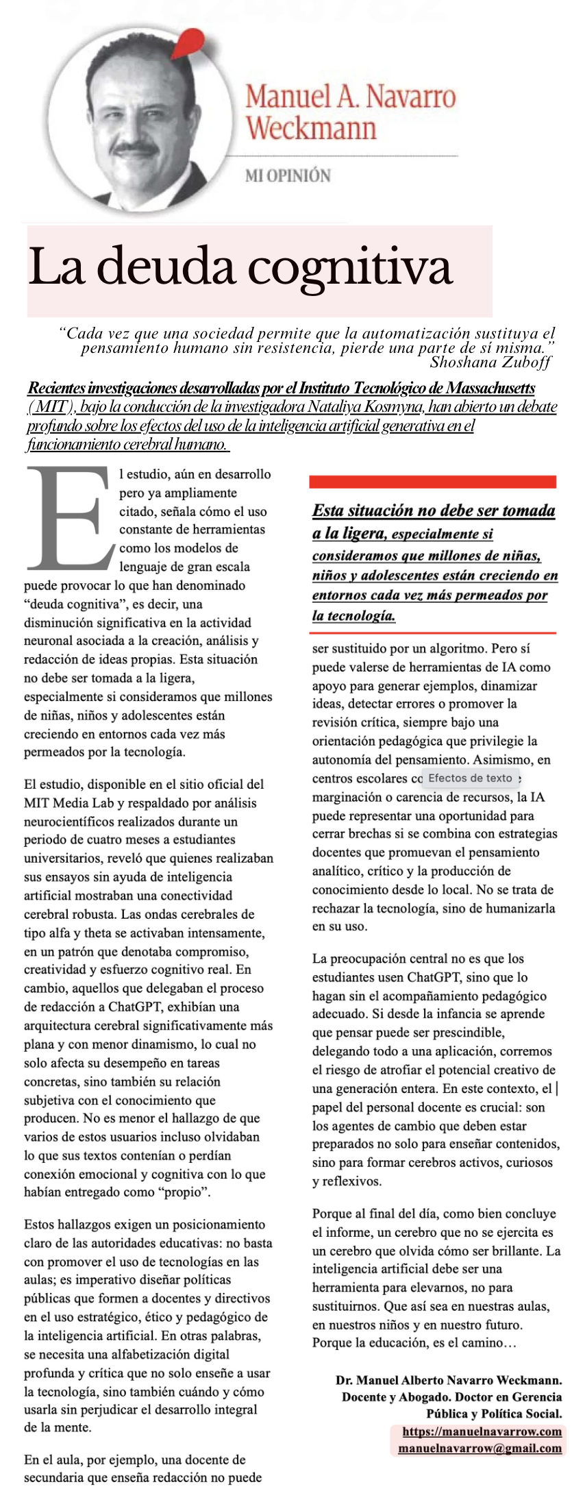Porque al final del día, como bien concluye el informe, un cerebro que no se ejercita es un cerebro que olvida cómo ser brillante. La inteligencia artificial debe ser una herramienta para elevarnos, no para sustituirnos. Que así sea en nuestras aulas, en nuestros niños y en nuestro futuro. Porque la educación es el camino…
