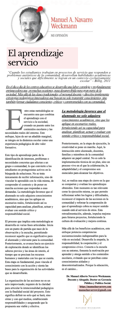 “Cuando los estudiantes trabajan en proyectos de servicio que responden a problemas auténticos de la comunidad, desarrollan habilidades académicas y sociales que difícilmente se logran en un contexto exclusivamente escolar” – Billig, 2011