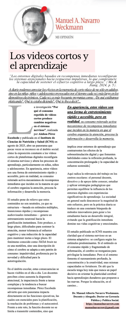 El estudio publicado en ICNS muestra con claridad que el sistema nervioso es un sistema adaptativo: se configura según los estímulos predominantes. Si el estímulo es el consumo rápido y fragmentado de información, el cerebro se reorganiza para privilegiar la inmediatez. Pero si el entorno fomenta el razonamiento profundo, la concentración y la creatividad, esas mismas capacidades se fortalecen. De ahí que la escuela tenga hoy más que nunca un papel decisivo en orientar la plasticidad cerebral hacia aprendizajes duraderos que preparen a las nuevas generaciones para enfrentar los desafíos académicos, sociales y emocionales del futuro. Porque la educación, es el camino…