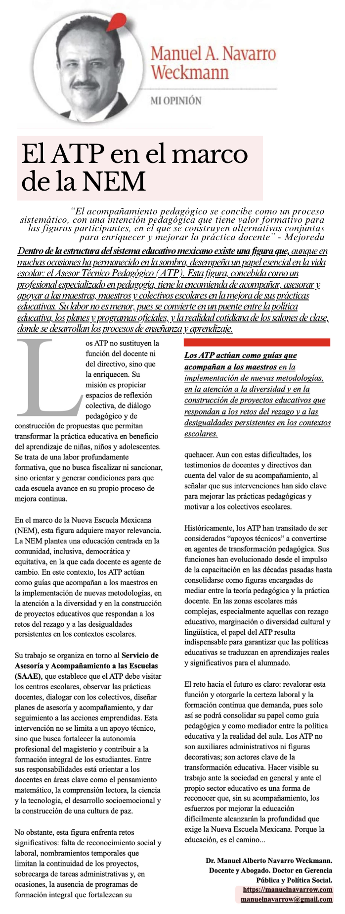 El reto hacia el futuro es claro: revalorar esta función y otorgarle la certeza laboral y la formación continua que demanda, pues solo así se podrá consolidar su papel como guía pedagógica y como mediador entre la política educativa y la realidad del aula. Los ATP no son auxiliares administrativos ni figuras decorativas; son actores clave de la transformación educativa. Hacer visible su trabajo ante la sociedad en general y ante el propio sector educativo es una forma de reconocer que, sin su acompañamiento, los esfuerzos por mejorar la educación difícilmente alcanzarán la profundidad que exige la Nueva Escuela Mexicana. Porque la educación es el camino…