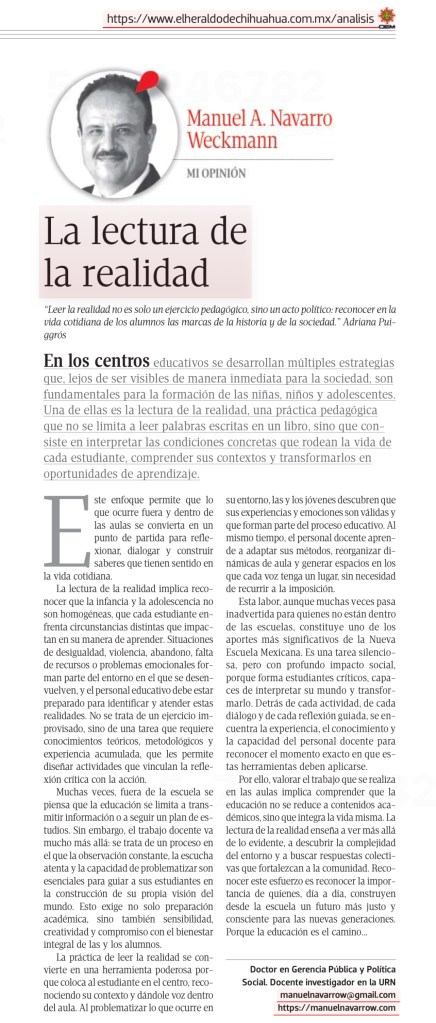 La lectura de la realidad implica reconocer que la infancia y la adolescencia no son homogéneas, que cada estudiante enfrenta circunstancias distintas que impactan en su manera de aprender. Situaciones de desigualdad, violencia, abandono, falta de recursos o problemas emocionales forman parte del entorno en el que se desenvuelven, y el personal educativo debe estar preparado para identificar y atender estas realidades. No se trata de un ejercicio improvisado, sino de una tarea que requiere conocimientos teóricos, metodológicos y experiencia acumulada, que les permite diseñar actividades que vinculan la reflexión crítica con la acción.