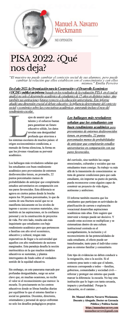 En el año 2022, la Organización para la Cooperación y el Desarrollo Económicos (OCDE) publicó un informe basado en los resultados de la evaluación PISA, en el cual se analizó no solo el desempeño académico de estudiantes de 15 años en distintos países, sino también sus aspiraciones futuras respecto a la educación universitaria. Este informe añadió una dimensión crucial al debate educativo: la influencia determinante del contexto social y económico sobre las expectativas académicas, superando incluso el peso del rendimiento escolar.