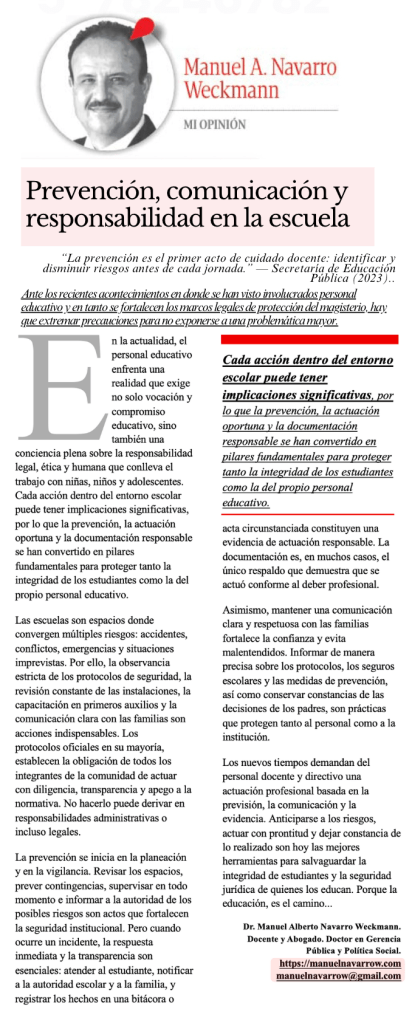 Las escuelas son espacios donde convergen múltiples riesgos: accidentes, conflictos, emergencias y situaciones imprevistas. Por ello, la observancia estricta de los protocolos de seguridad, la revisión constante de las instalaciones, la capacitación en primeros auxilios y la comunicación clara con las familias son acciones indispensables. Los protocolos oficiales en su mayoría, establecen la obligación de todos los integrantes de la comunidad de actuar con diligencia, transparencia y apego a la normativa. No hacerlo puede derivar en responsabilidades administrativas o incluso legales.