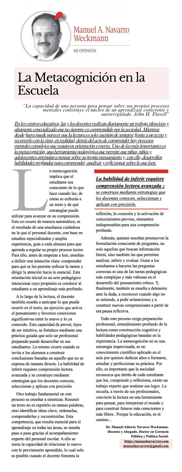 Todo este proceso exige preparación profesional, entendimiento profundo de la lectura como construcción cognitiva y habilidades pedagógicas basadas en la experiencia. La metacognición no es una estrategia improvisada; es un conocimiento científico aplicado en el aula por quienes dedican años a formarse, estudiar y perfeccionar su práctica. Por ello, es importante que la sociedad reconozca que detrás de cada estudiante que lee, comprende y reflexiona, existe un trabajo experto que sostiene ese logro. La escuela, a través de sus profesionales, convierte la lectura en una herramienta para pensar, para interpretar el mundo y para construir futuros más conscientes y más libres. Porque las educación es el camino…